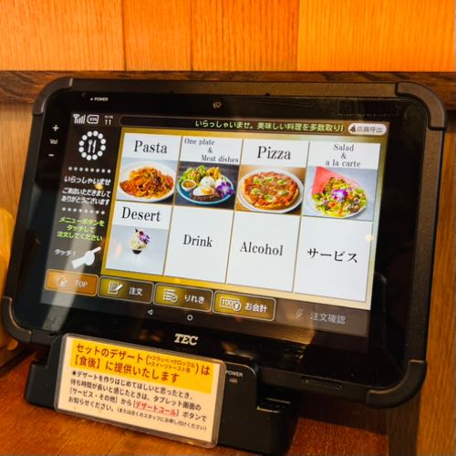 注文はタッチパネル方式。画面からパスタ・ピザ・ワンプレート・スイーツなどを選べます。