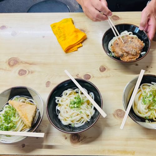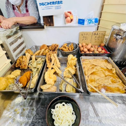 天ぷらを選んで会計し、自分で出汁を注ぐセルフスタイル。タクシーの運転手さんも一緒に食べて、金時豆の天ぷらを小分けでもらったよ。高野豆腐の天ぷらなど珍しいものもあったり、興味津々。外のベンチで啜る光景も香川らしい体験でした。