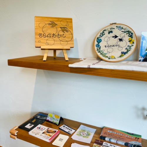 奥には手作りのロゴや刺繍など、温かみのあるインテリアも置かれていて、姉妹で営まれている雰囲気が伝わる心地よい空間です。