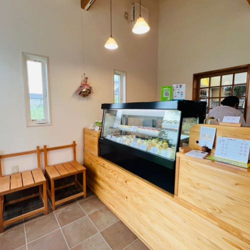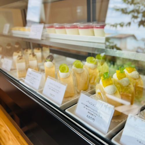 正面にはショーケースがあり、色とりどりのロールケーキやプリンが並んでいます。
