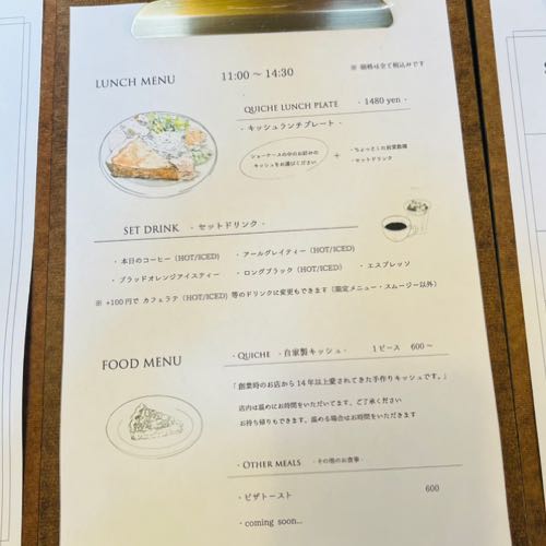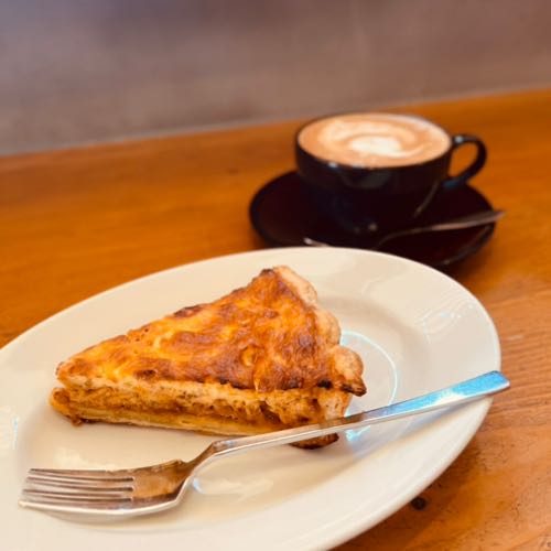 今回は単品で「キッシュ」と「シャインマスカットのパンケーキ」、そしてホットのカフェラテをオーダーしました。