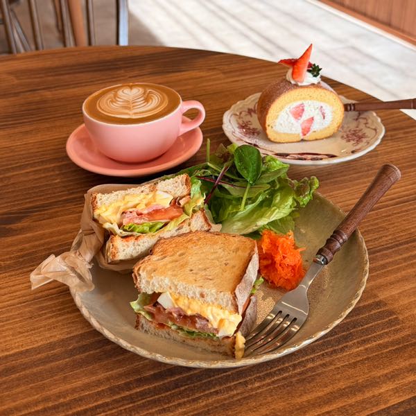 今回は「月替わりのモーニング(BLTサンド)」と、季節の「苺のロールケーキ」、そしてお決まりの「カフェラテ」を注文しました。