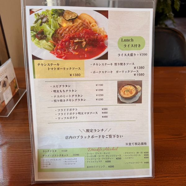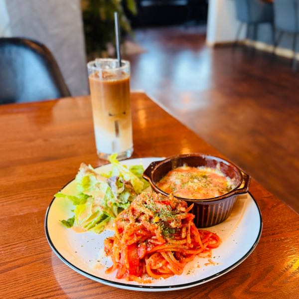 - ハーフグラタン がセットになった、夢のようなワンプレートです。ドリンクセット(+350円)でアイスカフェラテも追加しました。
