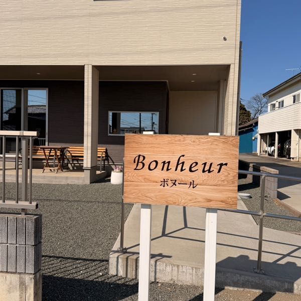 住宅街の中に溶け込む、ナチュラルでモダンな外観。木の温もりを感じる「Bonheur(ボヌール)」の看板が目印です。
