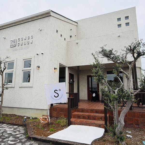 白を基調としたモダンな建物に「CONDO SALON sauna & cafe」の文字。入り口には清潔感のある旗がなびき、これから始まる「整い」の時間を予感させてくれます。