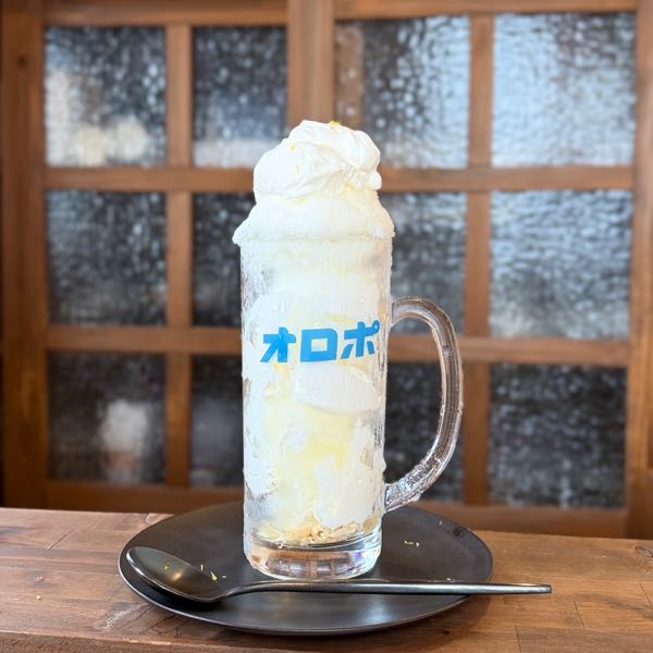 なんと、本物のジョッキに入って登場!いつものサイズよりボリューム満点でテンションが上がります。 一口食べると、オロポの味がしっかり再現されていて驚き。炭酸は入っていないはずなのに、口の中がシュワシュワと爽やかに広がる不思議な感覚…。